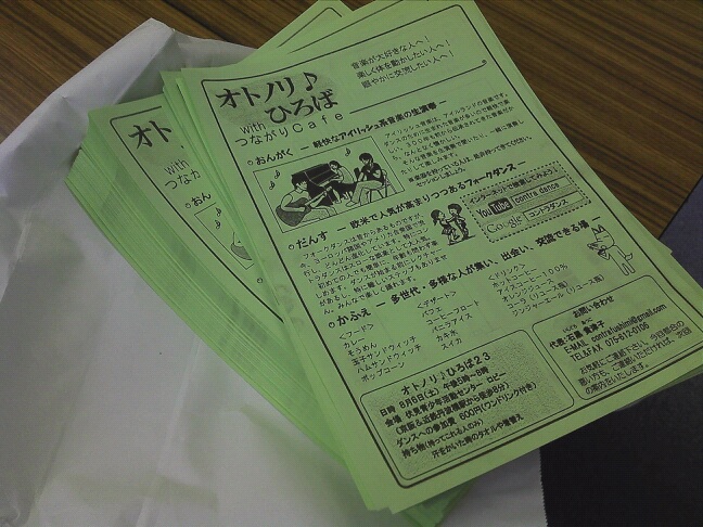 とはいっても、終業後の1時間で500枚程度やけどね。 前の実績では1000枚配布して、1人来る計算やから、 効果はあまり見込めないけど、 そのへんの動く力を武器にするしかないかない。 でも、実施した結果としては、イマイチやと思った。 なぜかっちゅうと、 人から嫌がられる広報やなぁと実感。 多くの人は広報されたり、営業されたりするのを嫌がる。 こっちかて、めっちゃ楽しいことを教えてんのに、嫌がられるのは、わりにあわん。 しかし、地域コミュニティ活性化の受け皿たらんとする理念でやっているので、 会場のご近所さんにはどうしてもお知らせしたいのです。 そういう広報ツールってないねんなー。 いっこ思ったんは、チラシが不要な人はポストにそういうシールを貼って、 意思表示してくれればなぁと思う。 その為にまず、「チラシ不要シール」をポスティングすべきかも、と思った。 もういっこは、皆が喜んでくれるフリーペーパーとして配ること。 それか、路上フライブ(演奏ビラ配り)に絞るか。 とにかく、地域内の広報手段で何かいいものは無いかなー。 wishigrow |